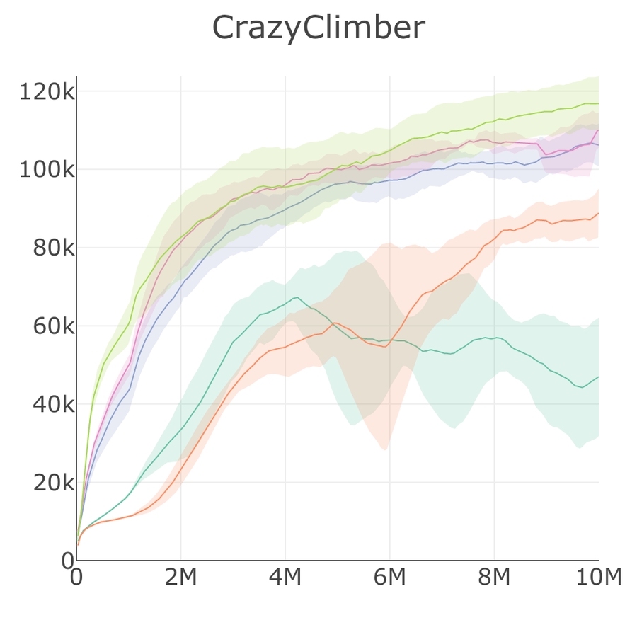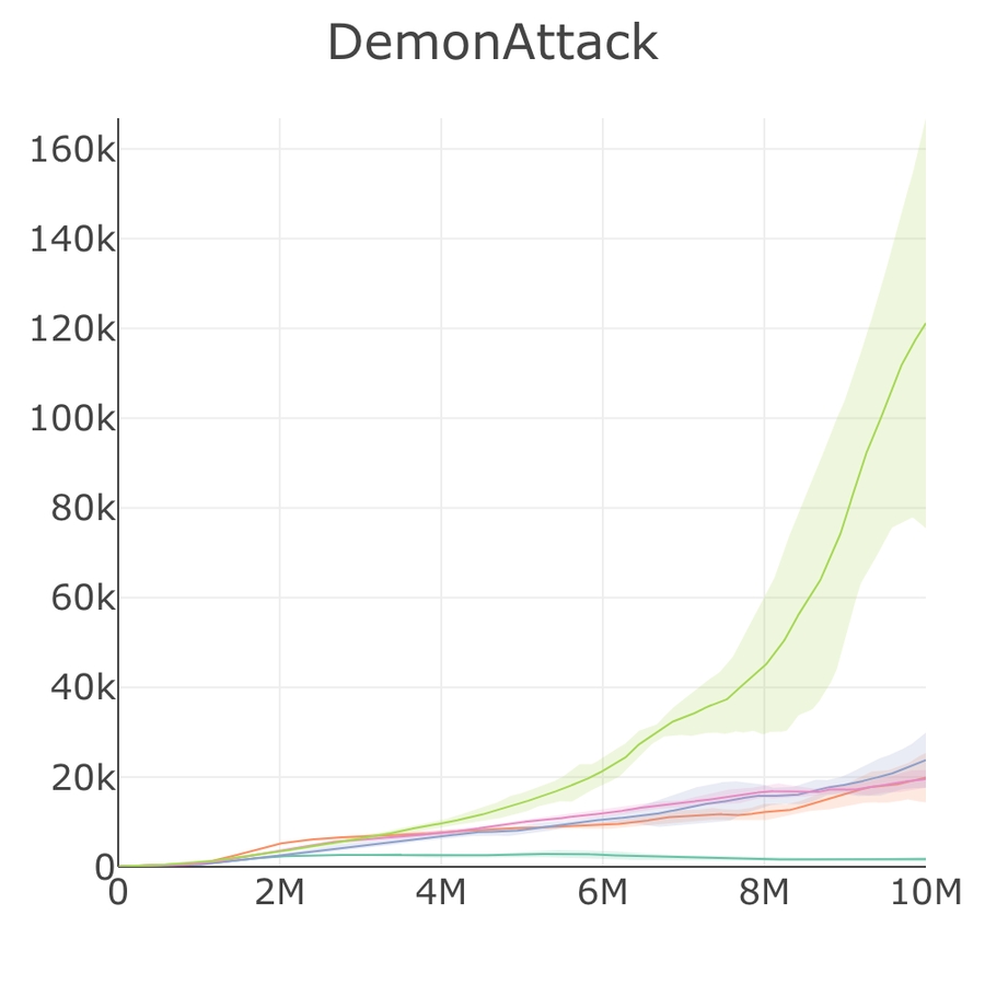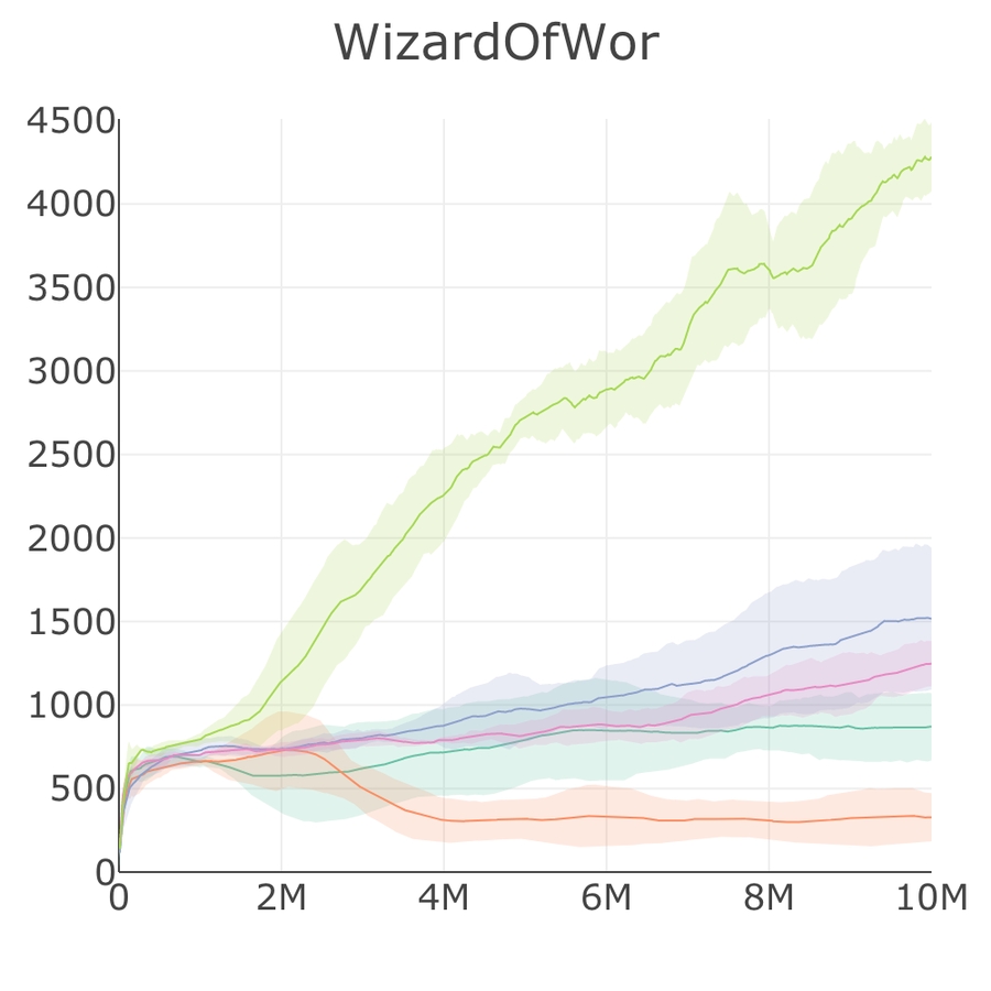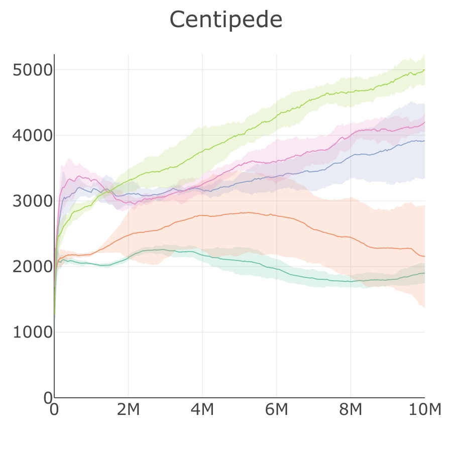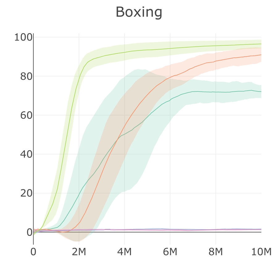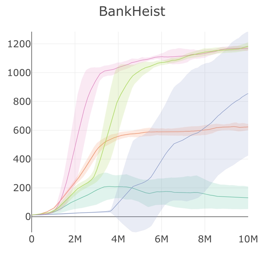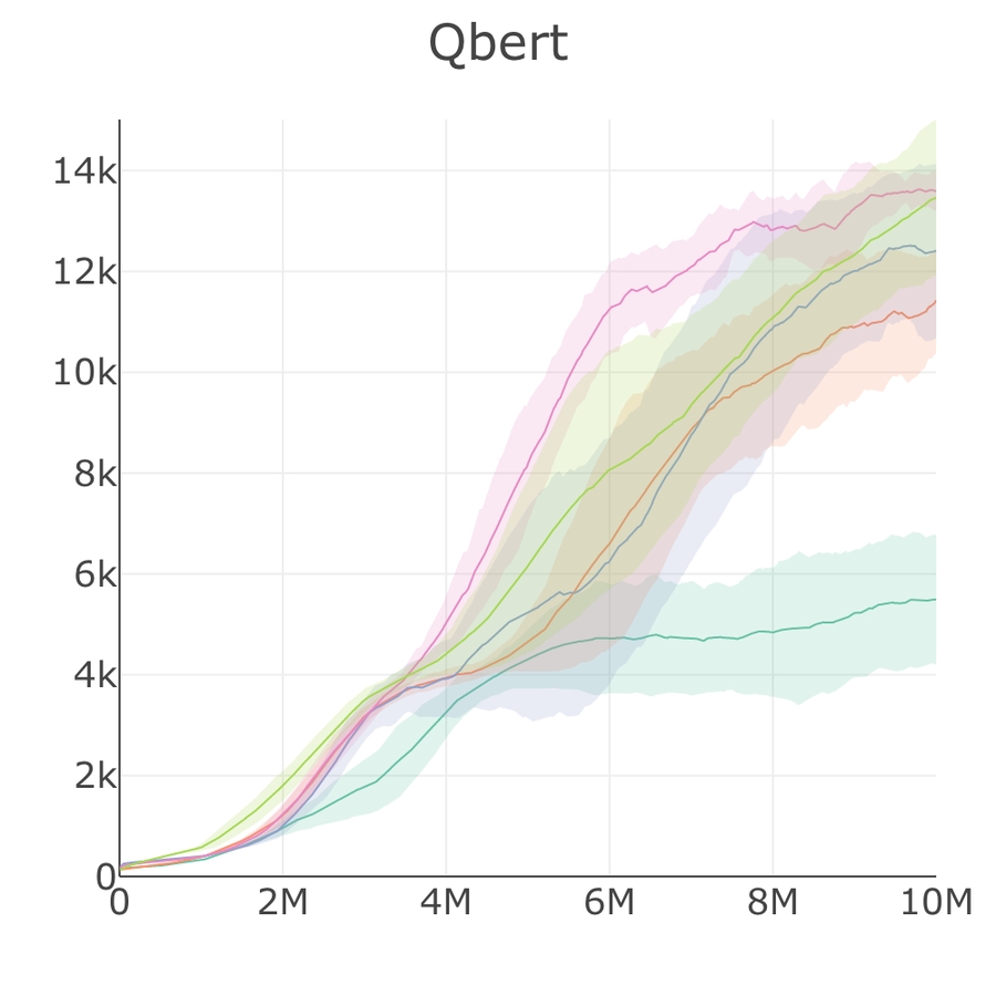 The table above presents results for 62 Atari games. All agents were trained for 10M frames (40M including skipped frames). Reported results are the episode score at the end of training, averaged over the previous 100 evaluation checkpoints with each checkpoint averaged over 4 Sessions. Agents were checkpointed every 10k training frames.