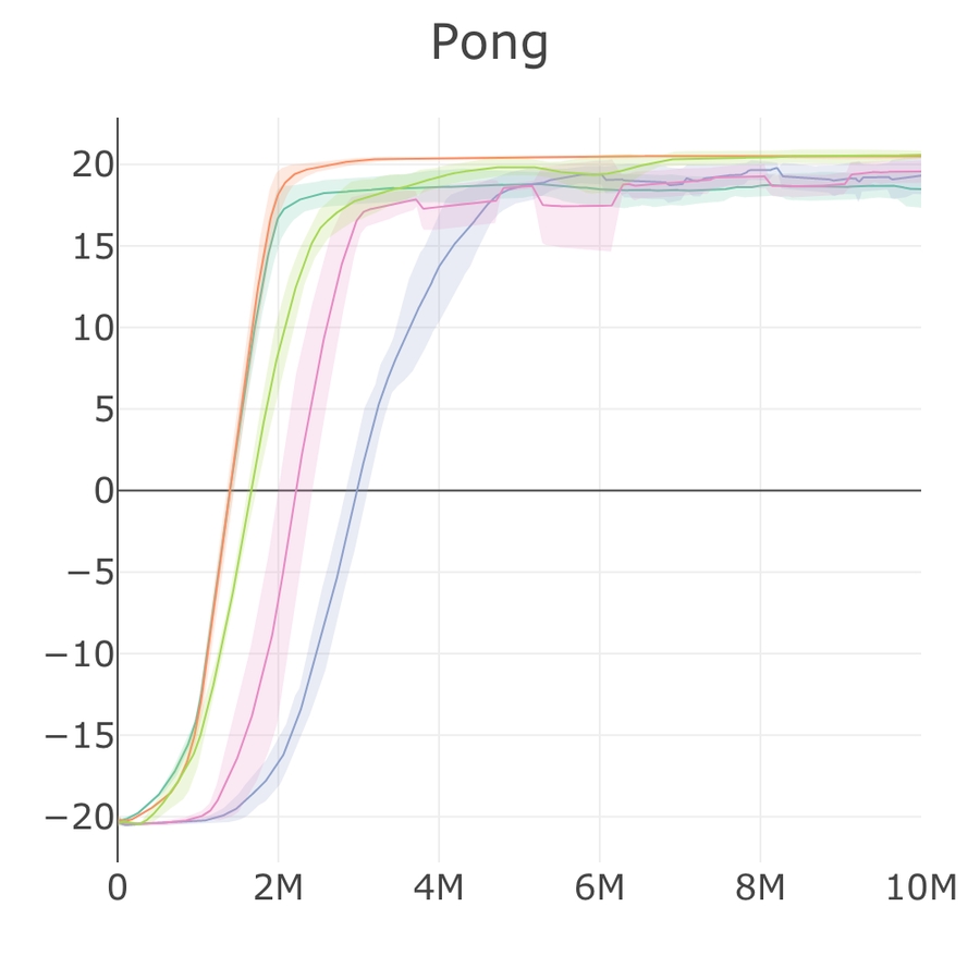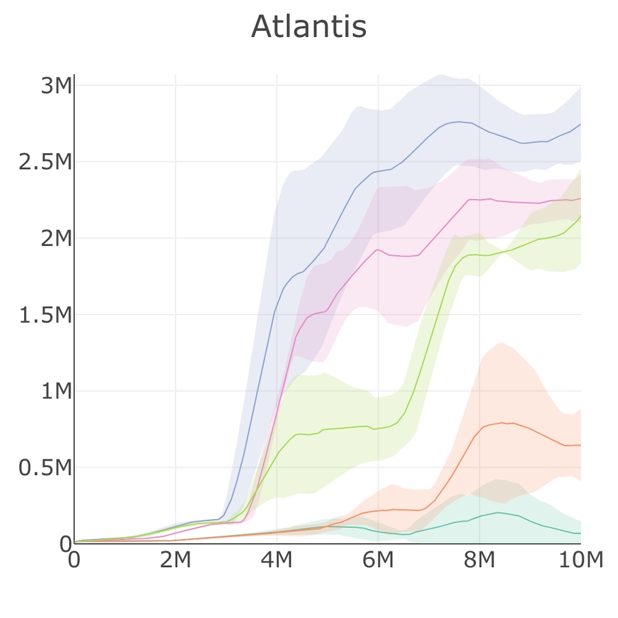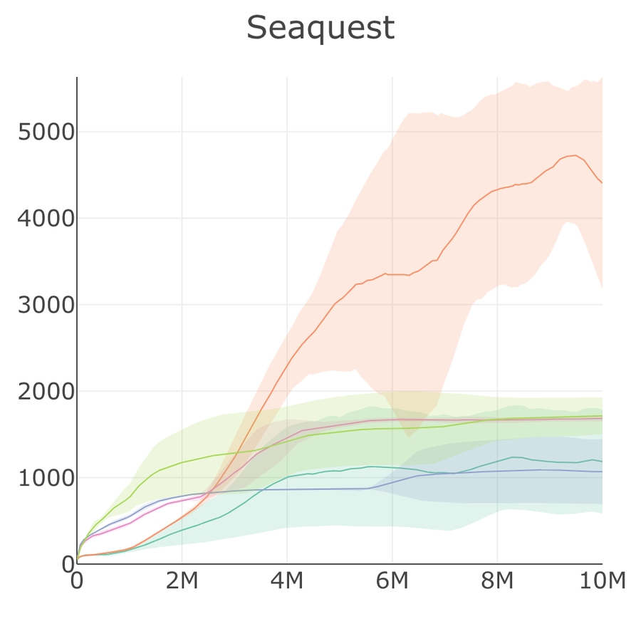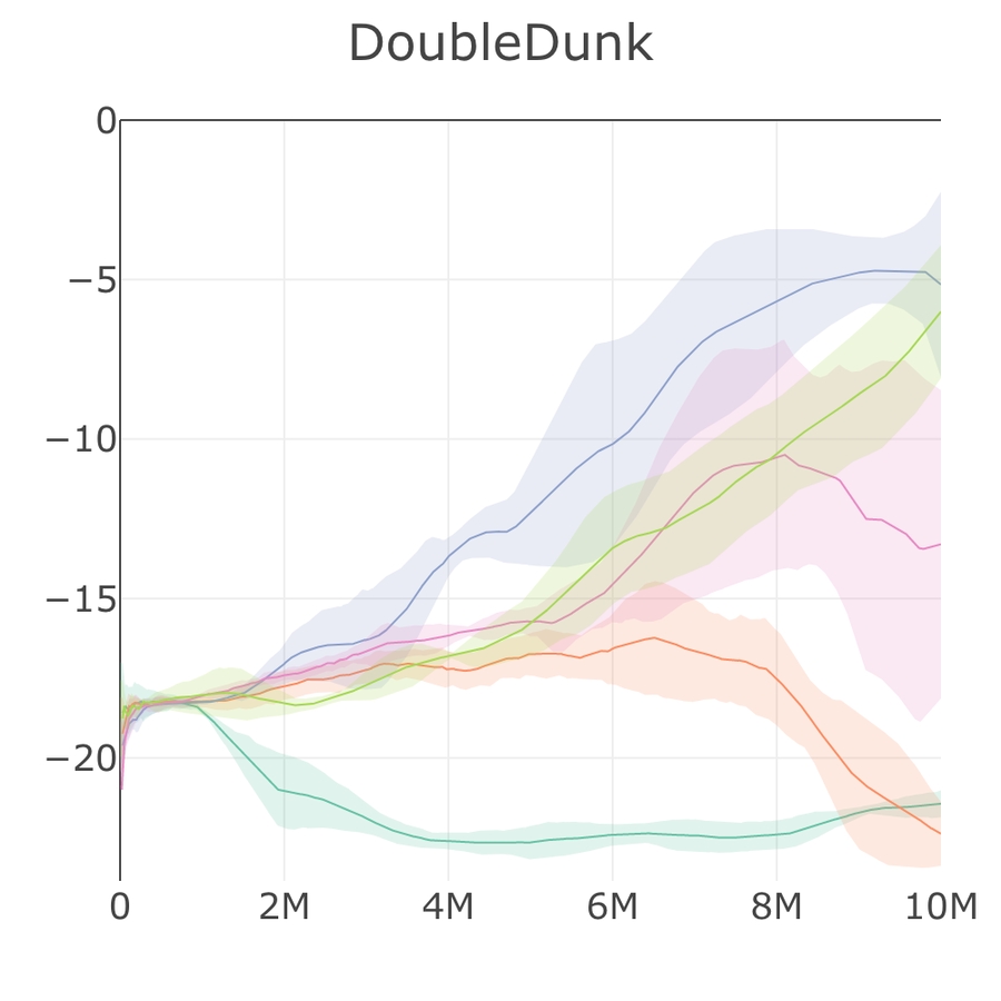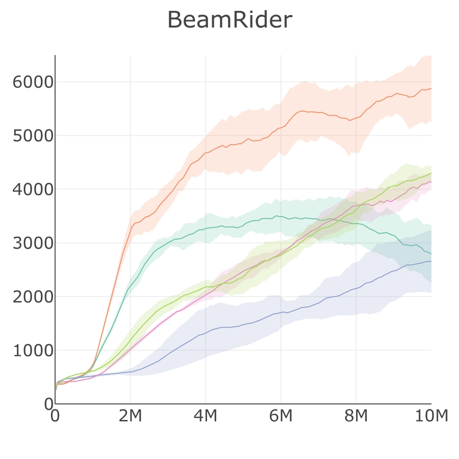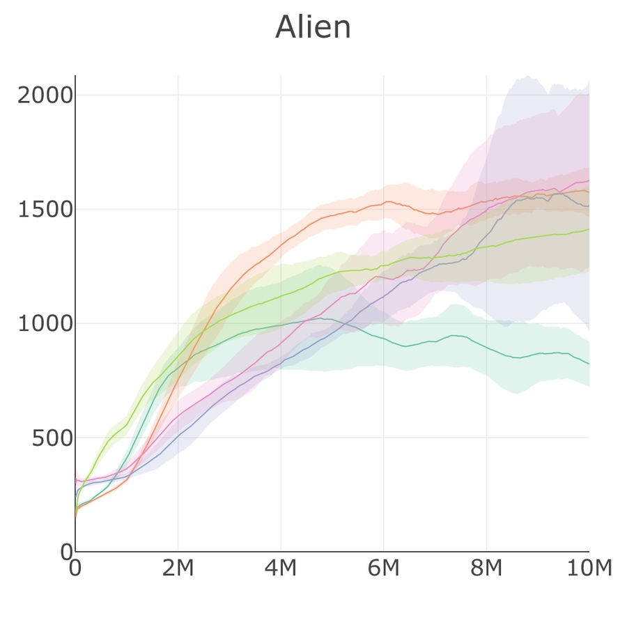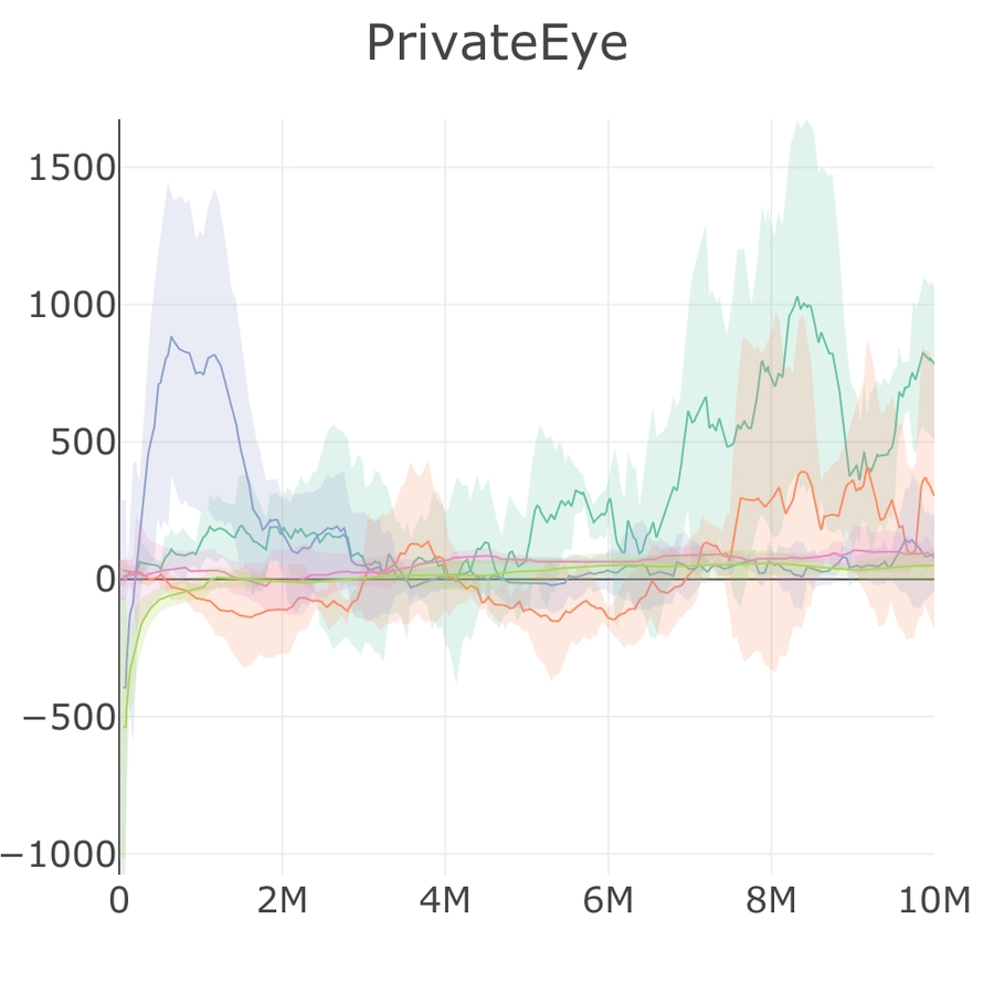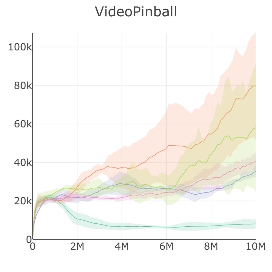 The table above presents results for 62 Atari games. All agents were trained for 10M frames (40M including skipped frames). Reported results are the episode score at the end of training, averaged over the previous 100 evaluation checkpoints with each checkpoint averaged over 4 Sessions. Agents were checkpointed every 10k training frames.