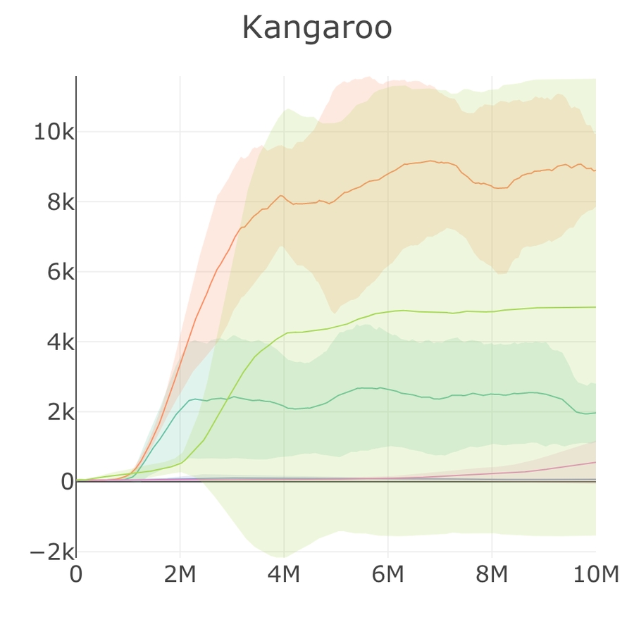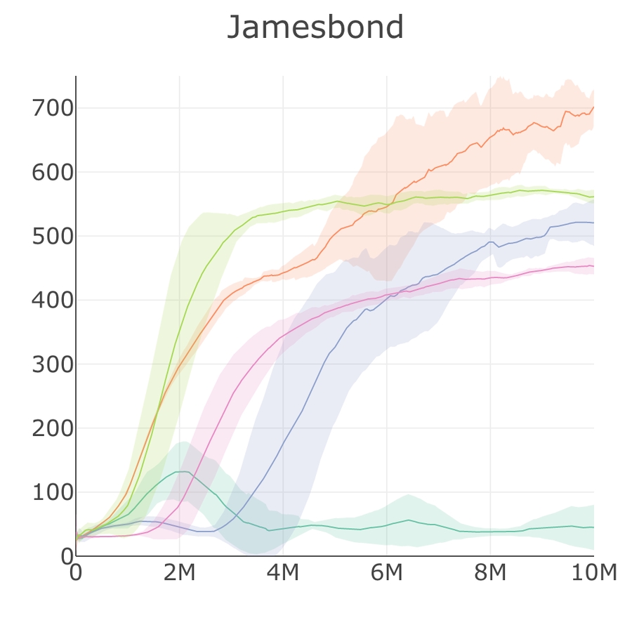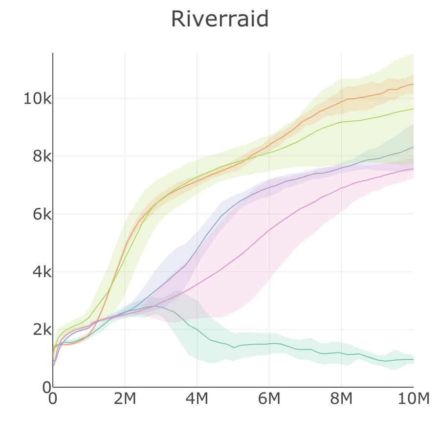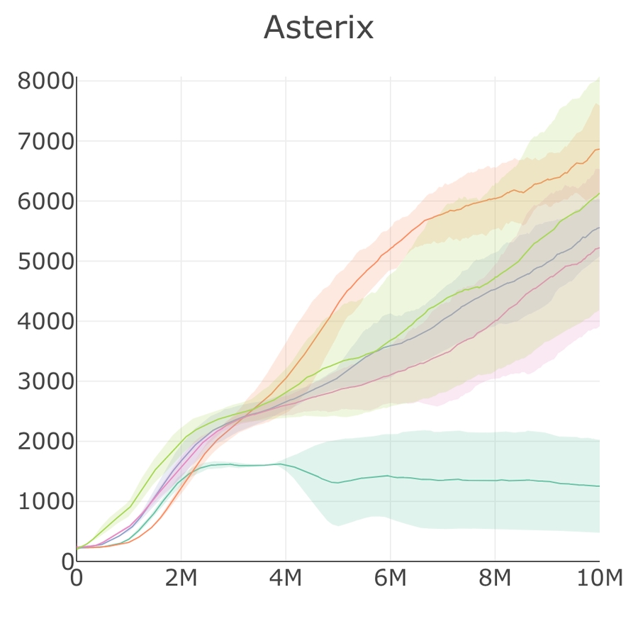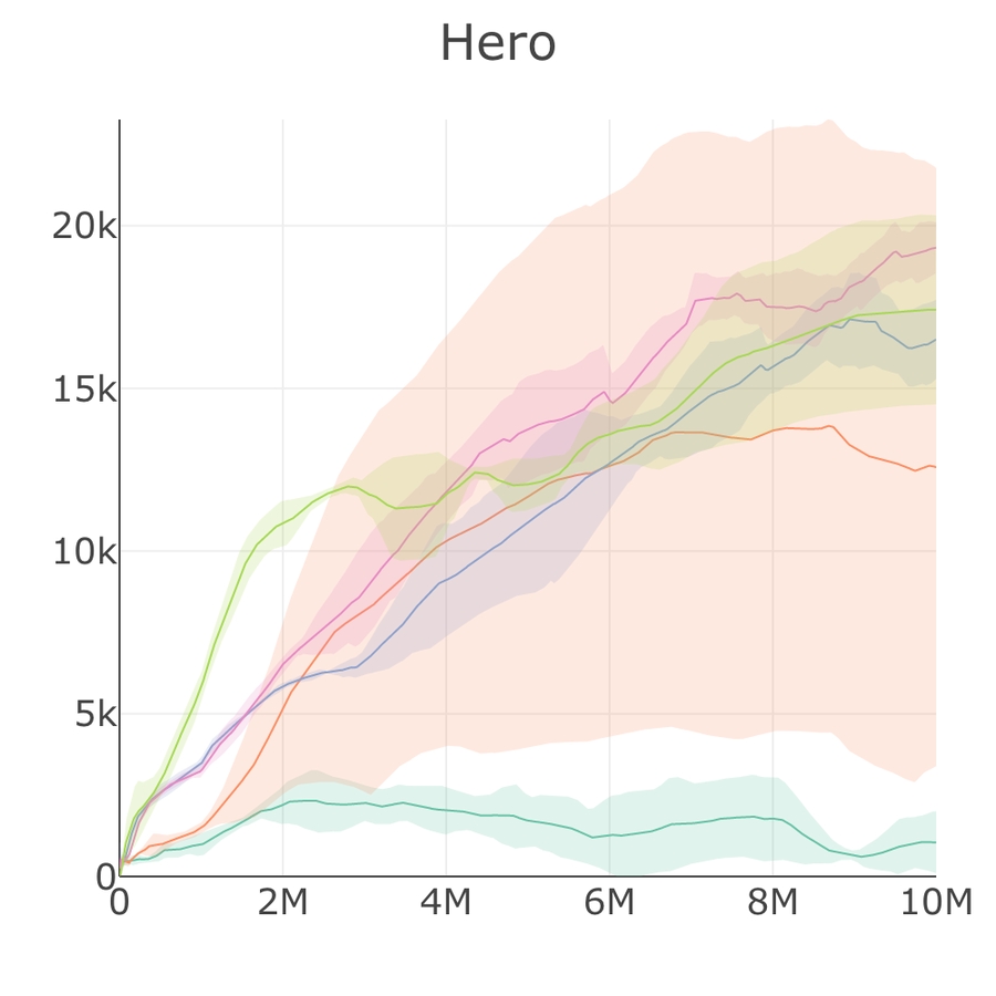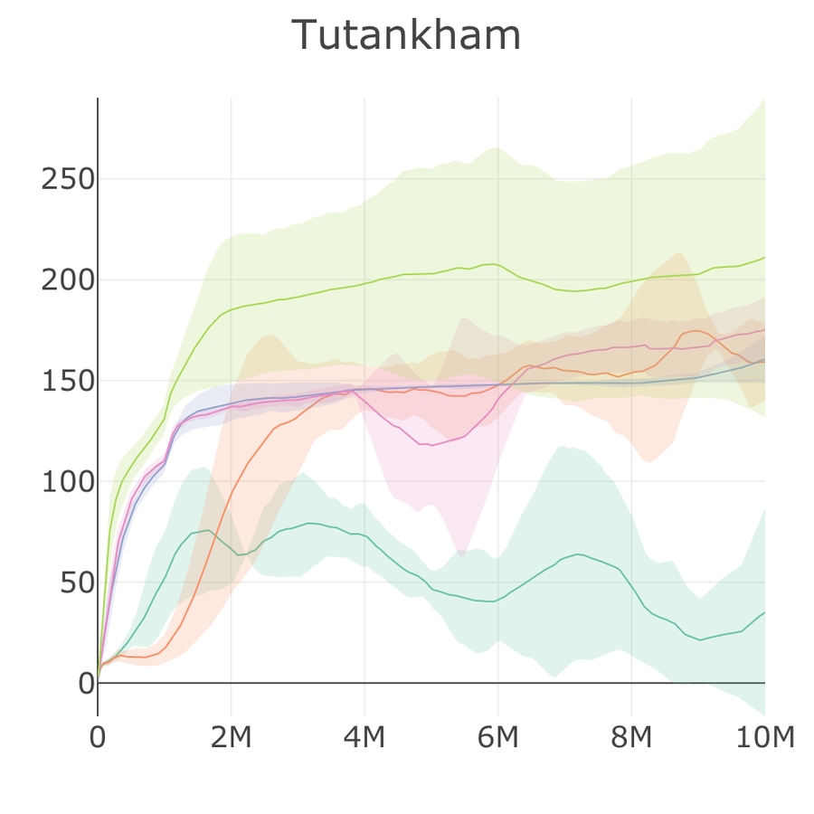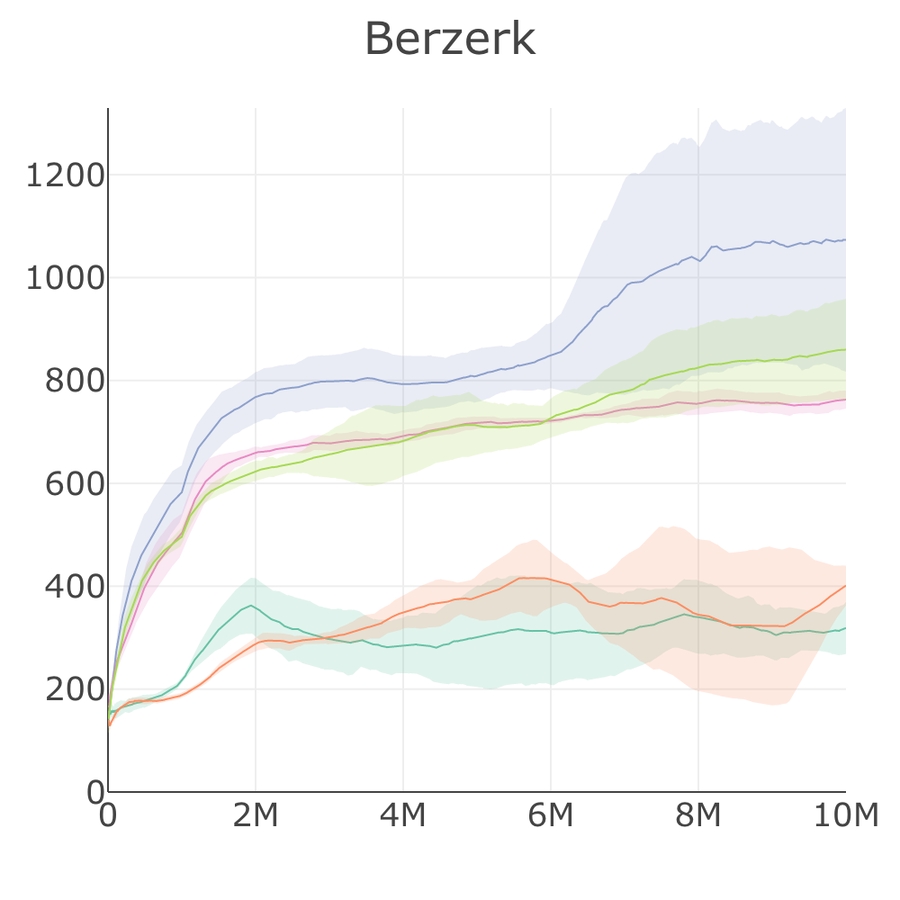 The table above presents results for 62 Atari games. All agents were trained for 10M frames (40M including skipped frames). Reported results are the episode score at the end of training, averaged over the previous 100 evaluation checkpoints with each checkpoint averaged over 4 Sessions. Agents were checkpointed every 10k training frames.
