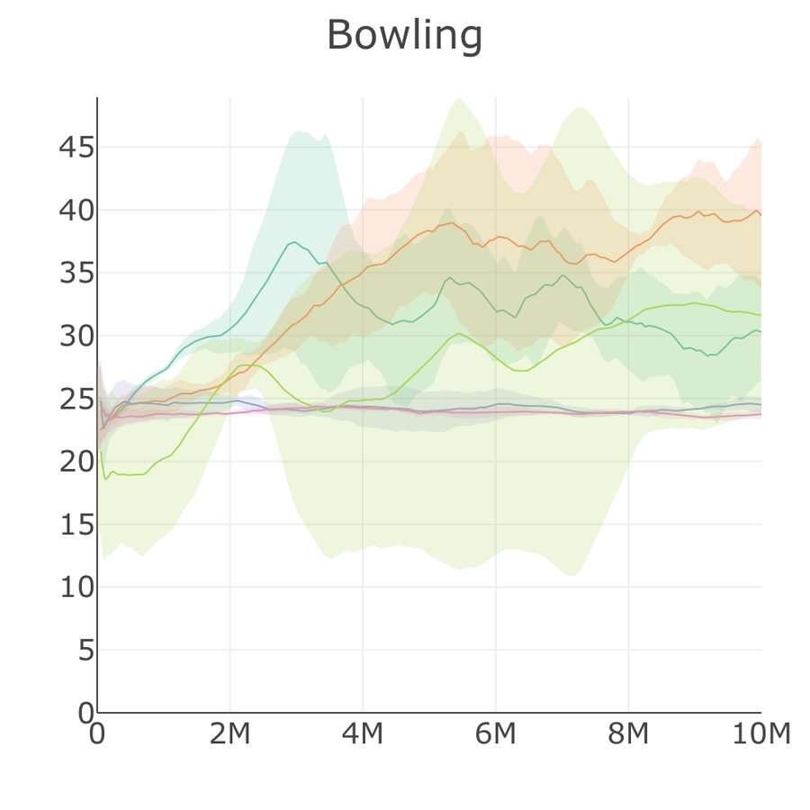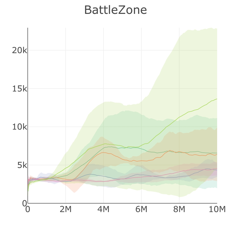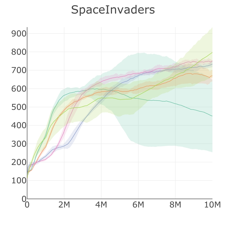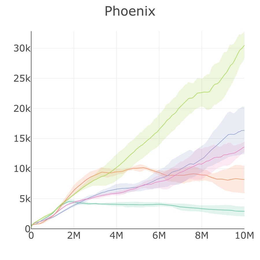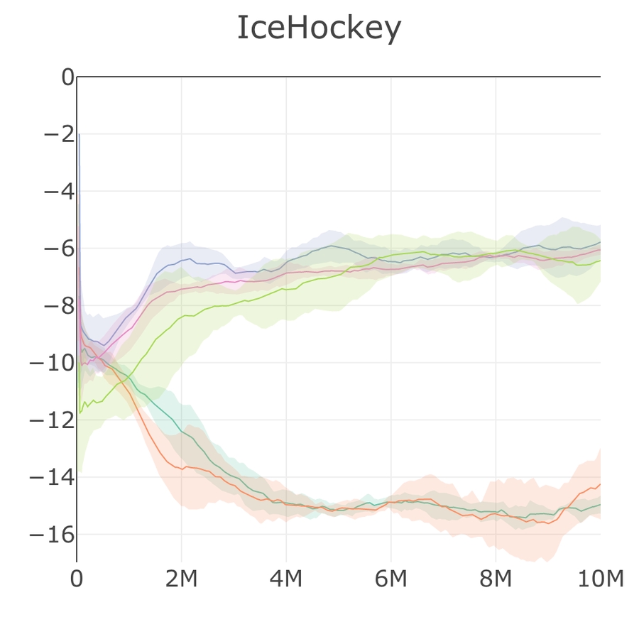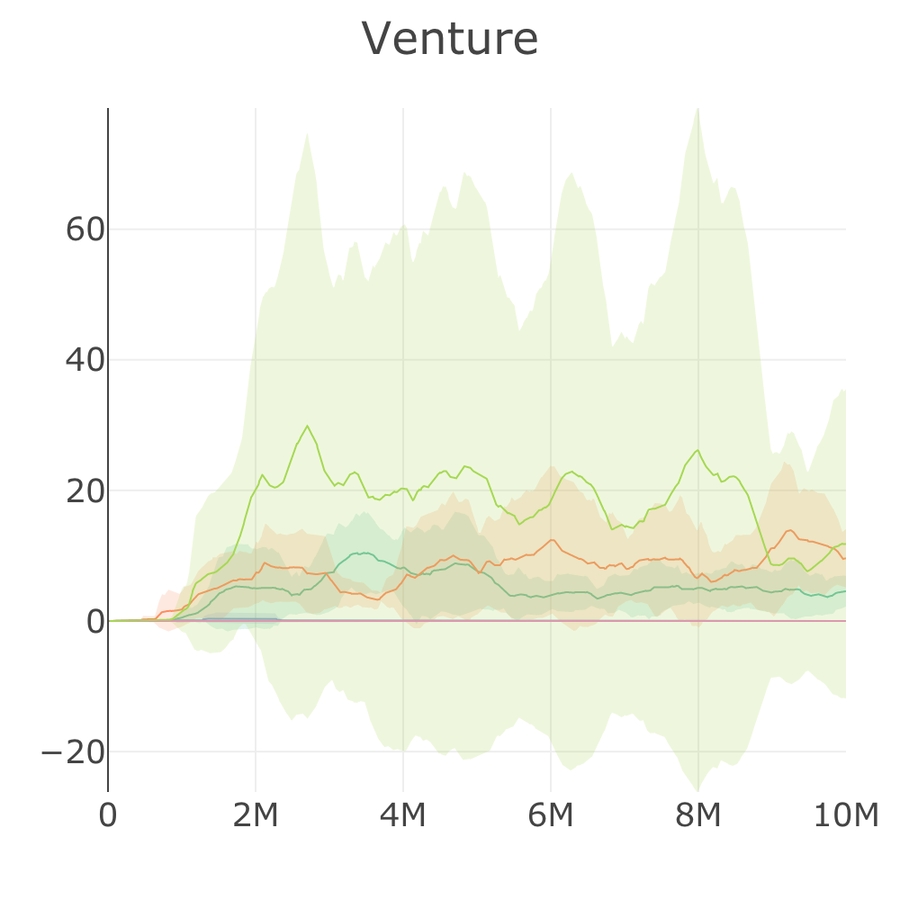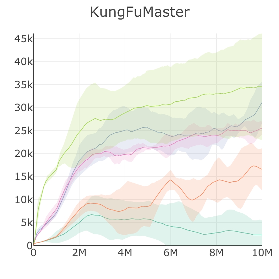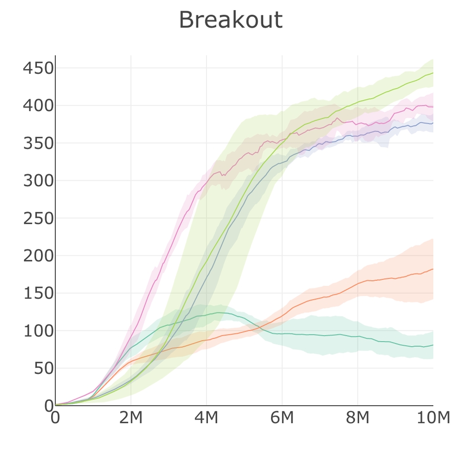 The table above presents results for 62 Atari games. All agents were trained for 10M frames (40M including skipped frames). Reported results are the episode score at the end of training, averaged over the previous 100 evaluation checkpoints with each checkpoint averaged over 4 Sessions. Agents were checkpointed every 10k training frames.