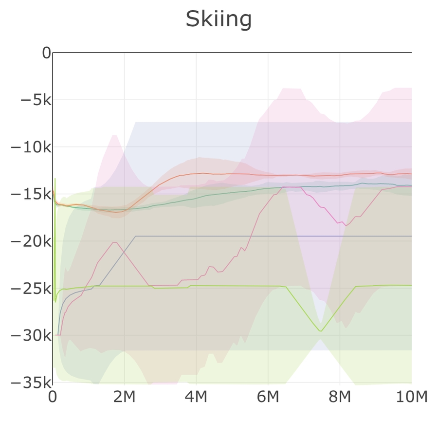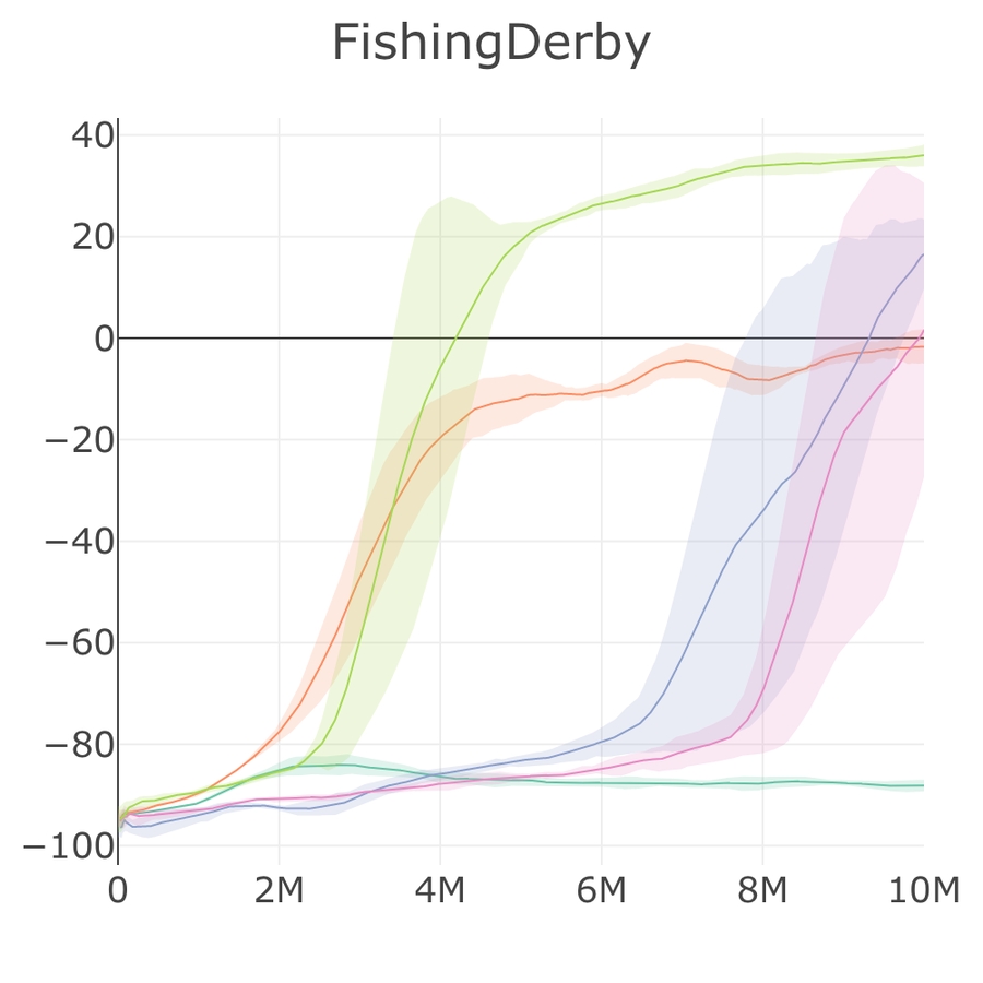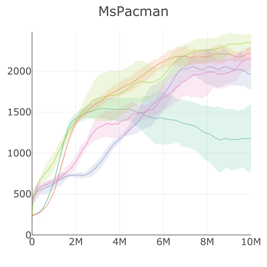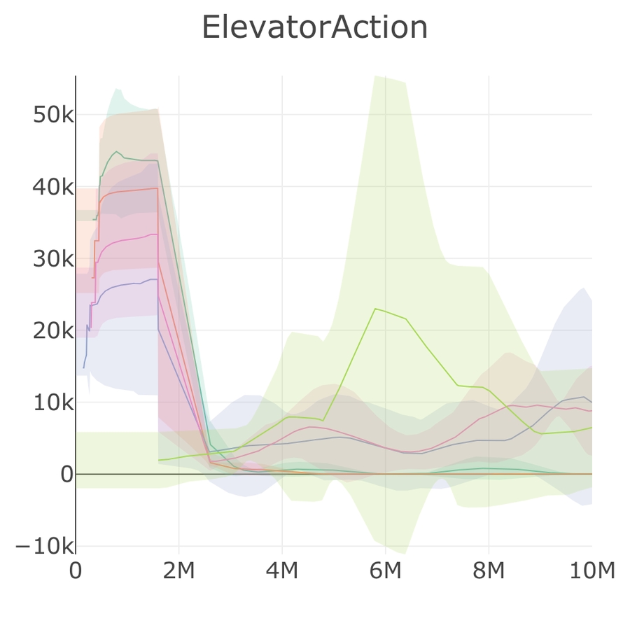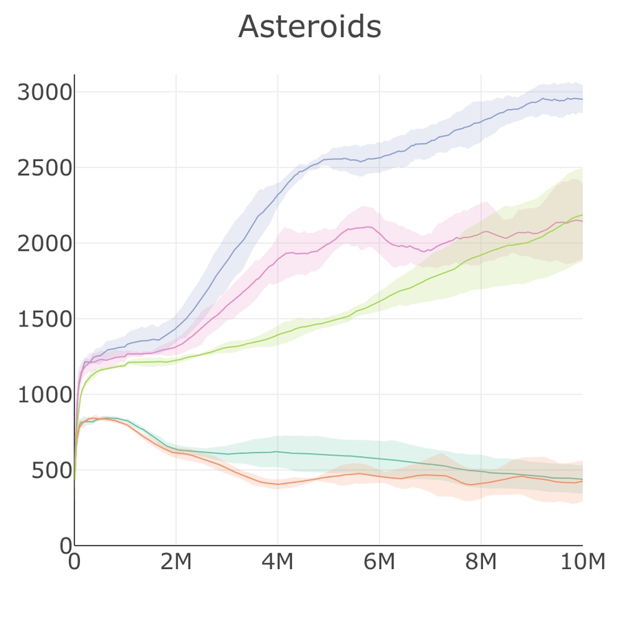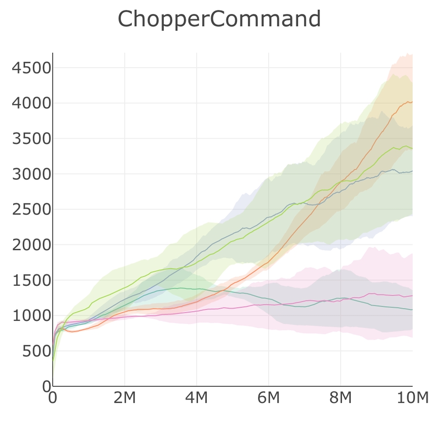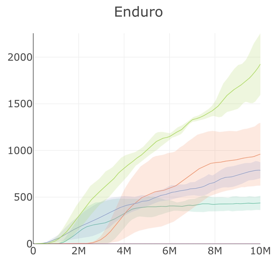 The table above presents results for 62 Atari games. All agents were trained for 10M frames (40M including skipped frames). Reported results are the episode score at the end of training, averaged over the previous 100 evaluation checkpoints with each checkpoint averaged over 4 Sessions. Agents were checkpointed every 10k training frames.