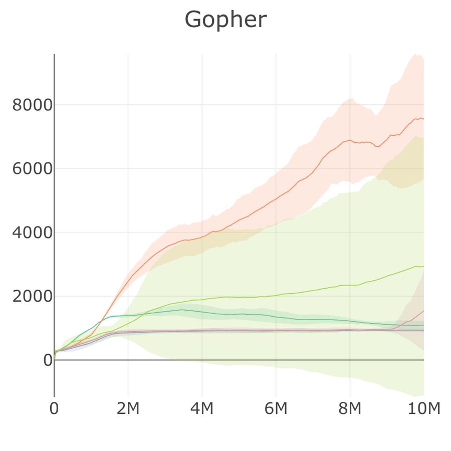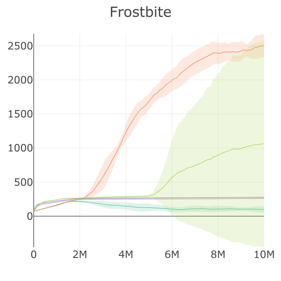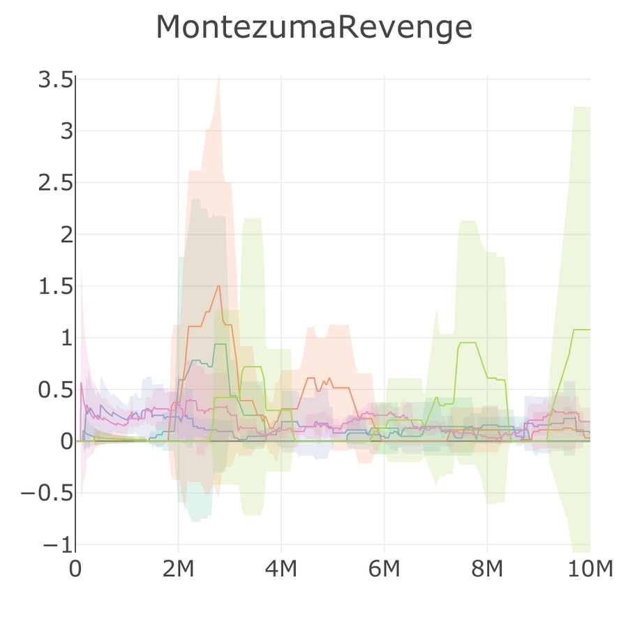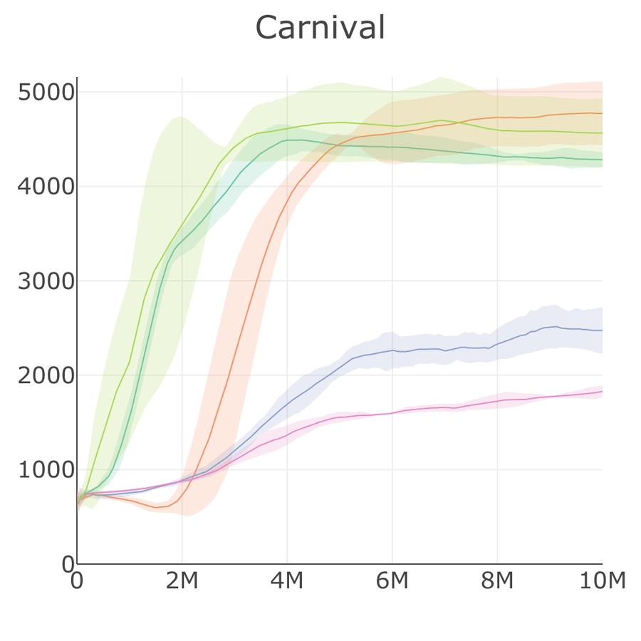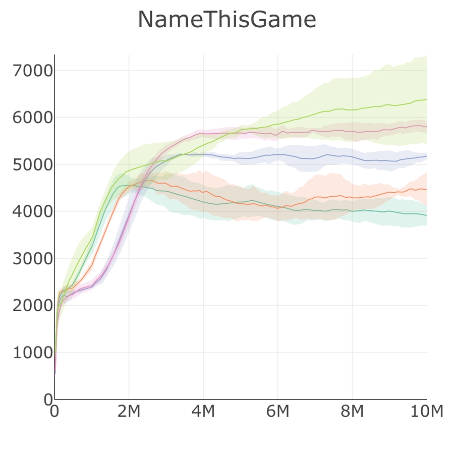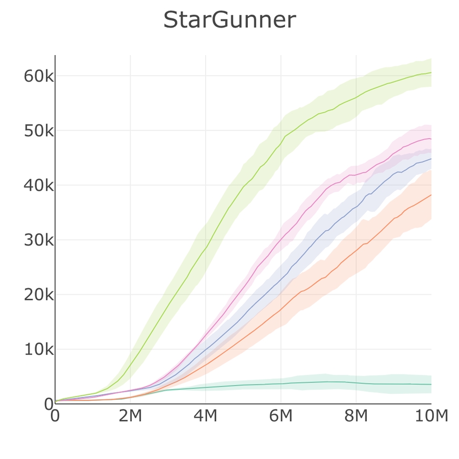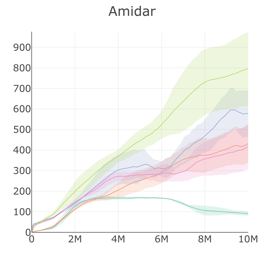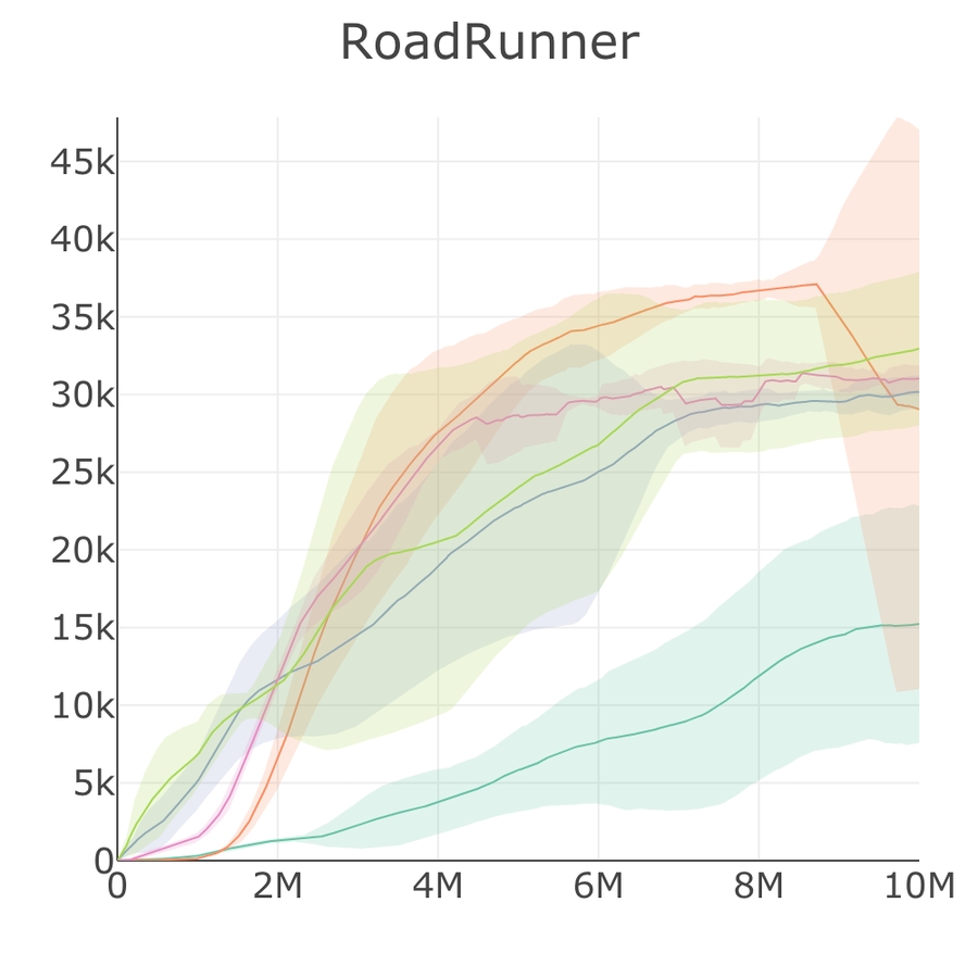 The table above presents results for 62 Atari games. All agents were trained for 10M frames (40M including skipped frames). Reported results are the episode score at the end of training, averaged over the previous 100 evaluation checkpoints with each checkpoint averaged over 4 Sessions. Agents were checkpointed every 10k training frames.