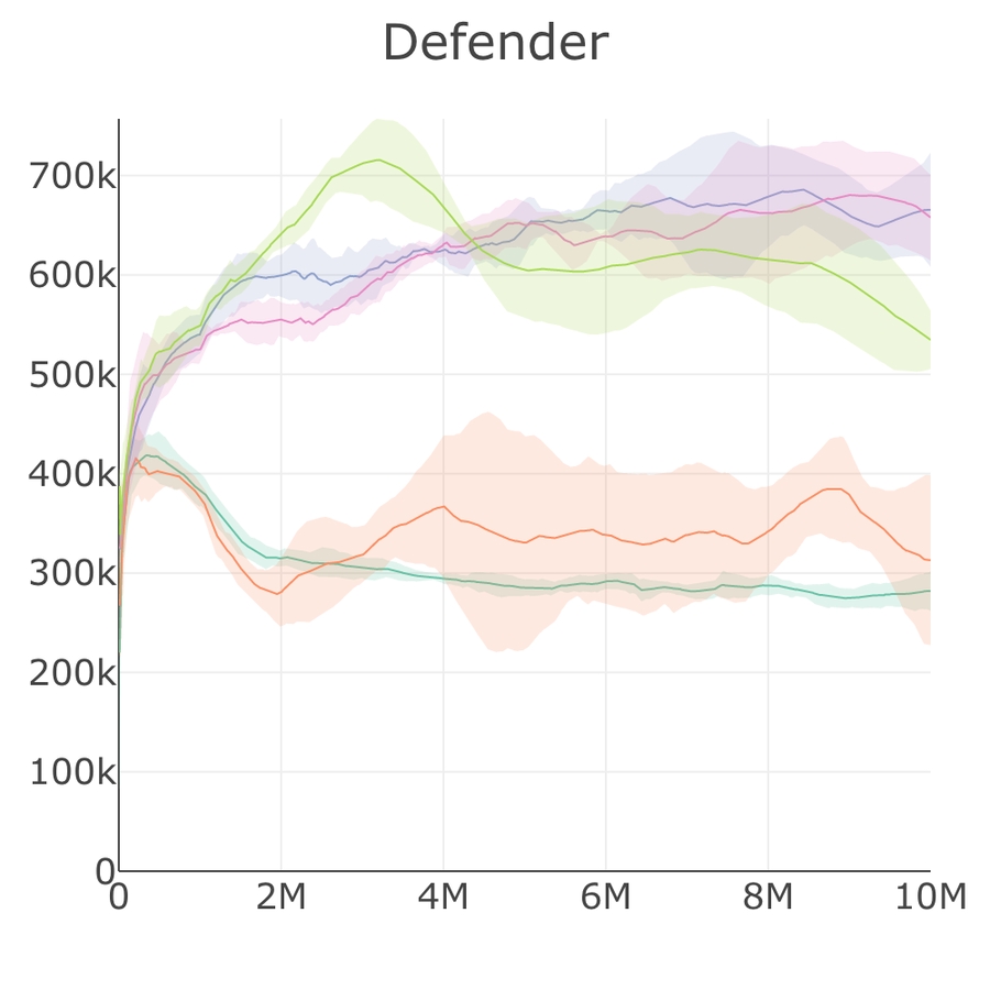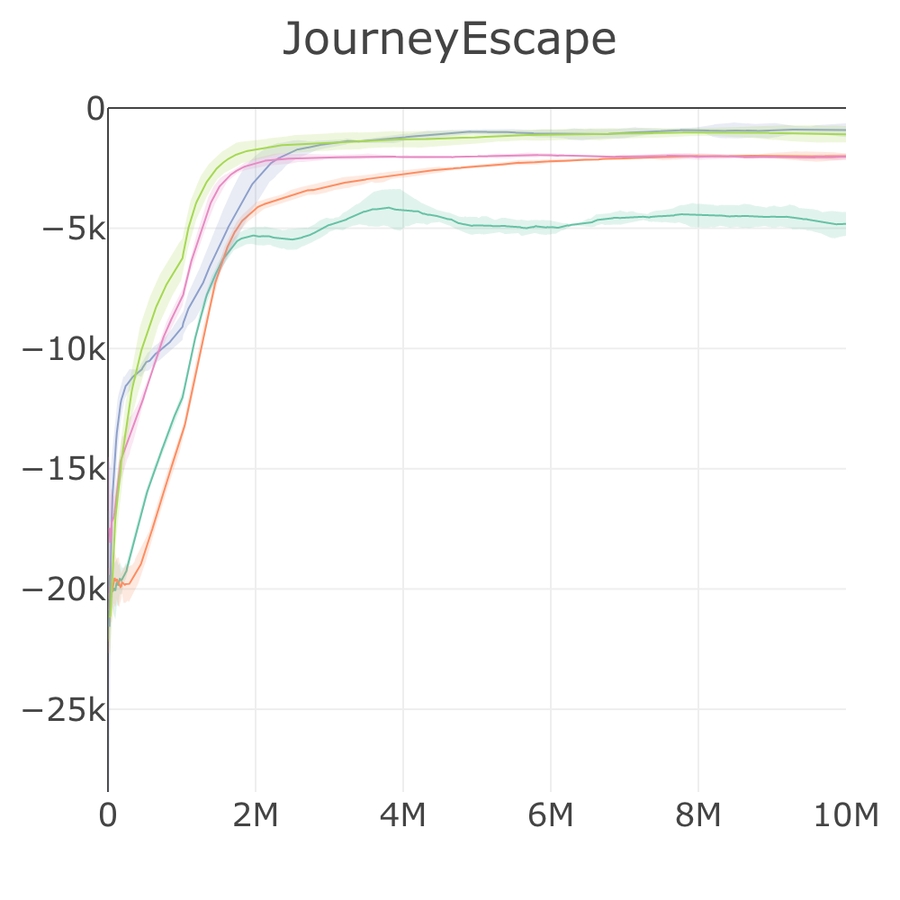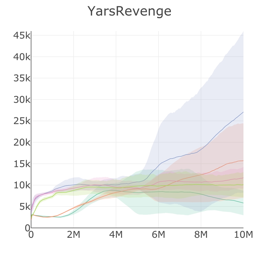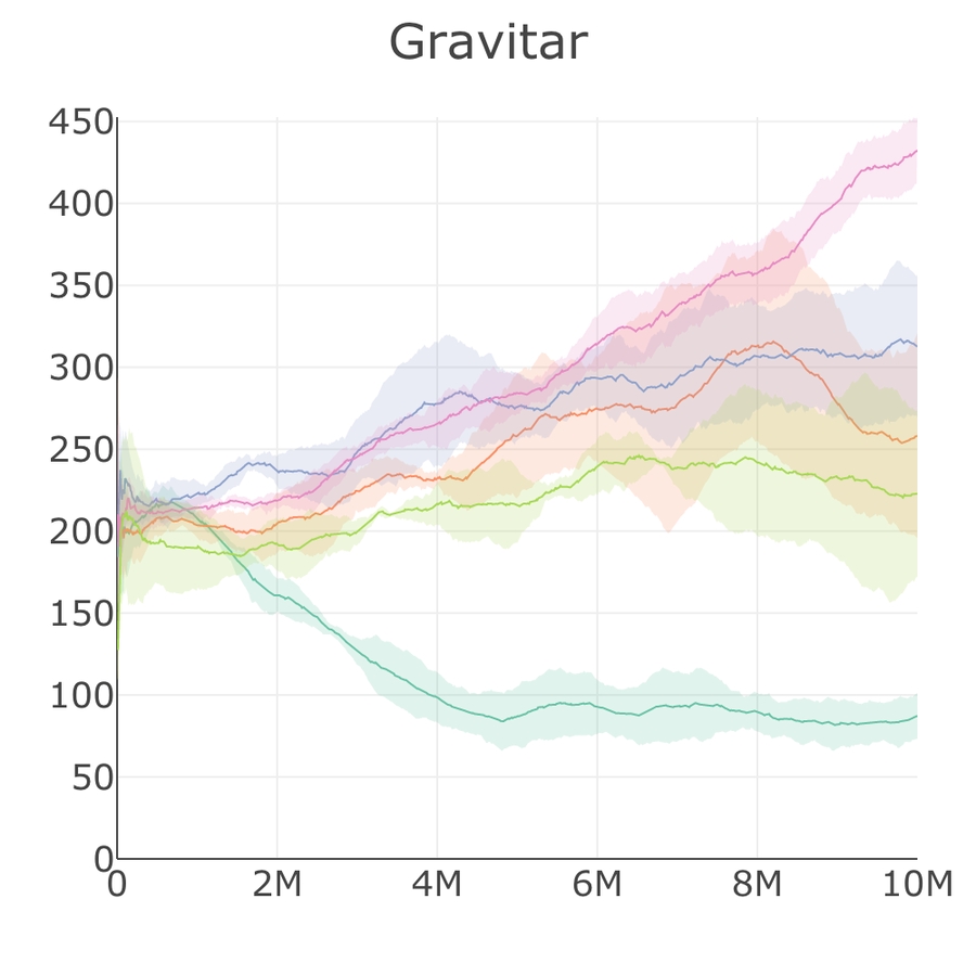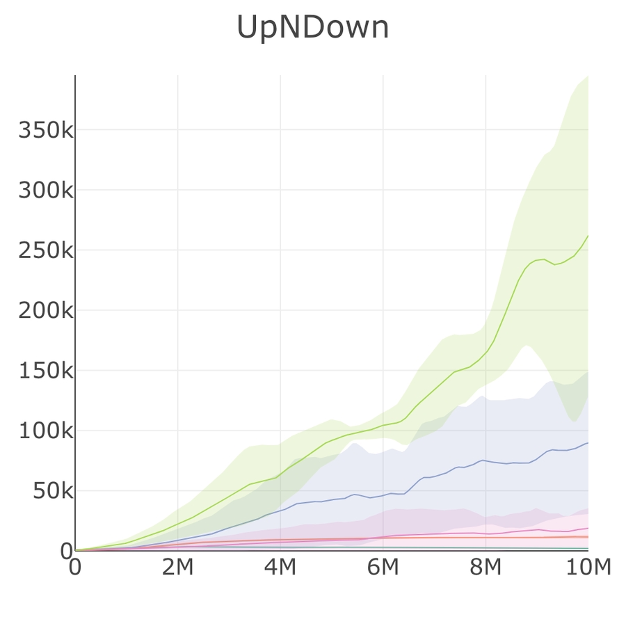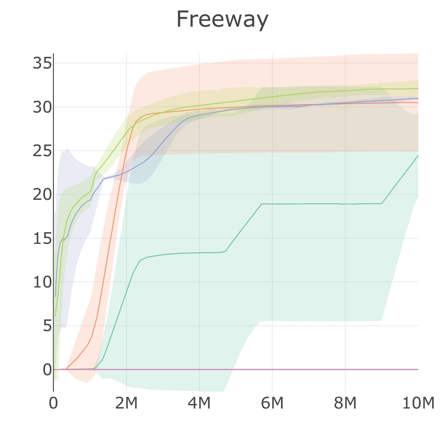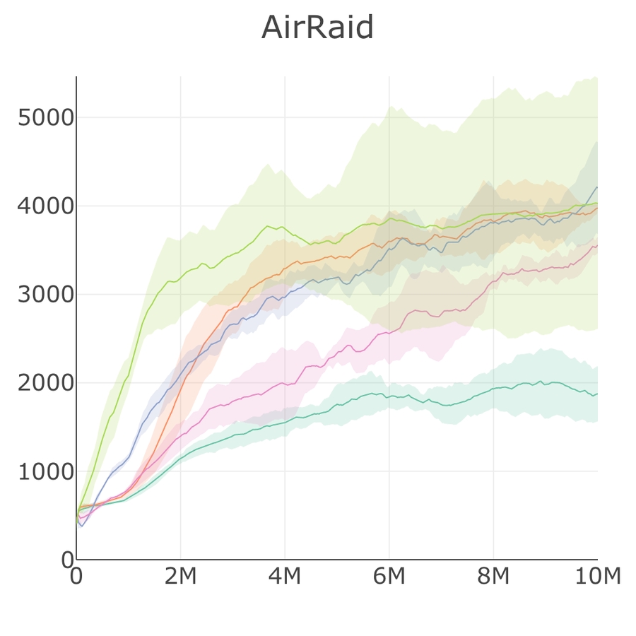 The table above presents results for 62 Atari games. All agents were trained for 10M frames (40M including skipped frames). Reported results are the episode score at the end of training, averaged over the previous 100 evaluation checkpoints with each checkpoint averaged over 4 Sessions. Agents were checkpointed every 10k training frames.