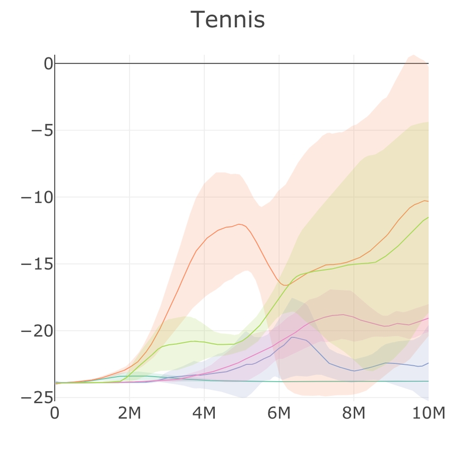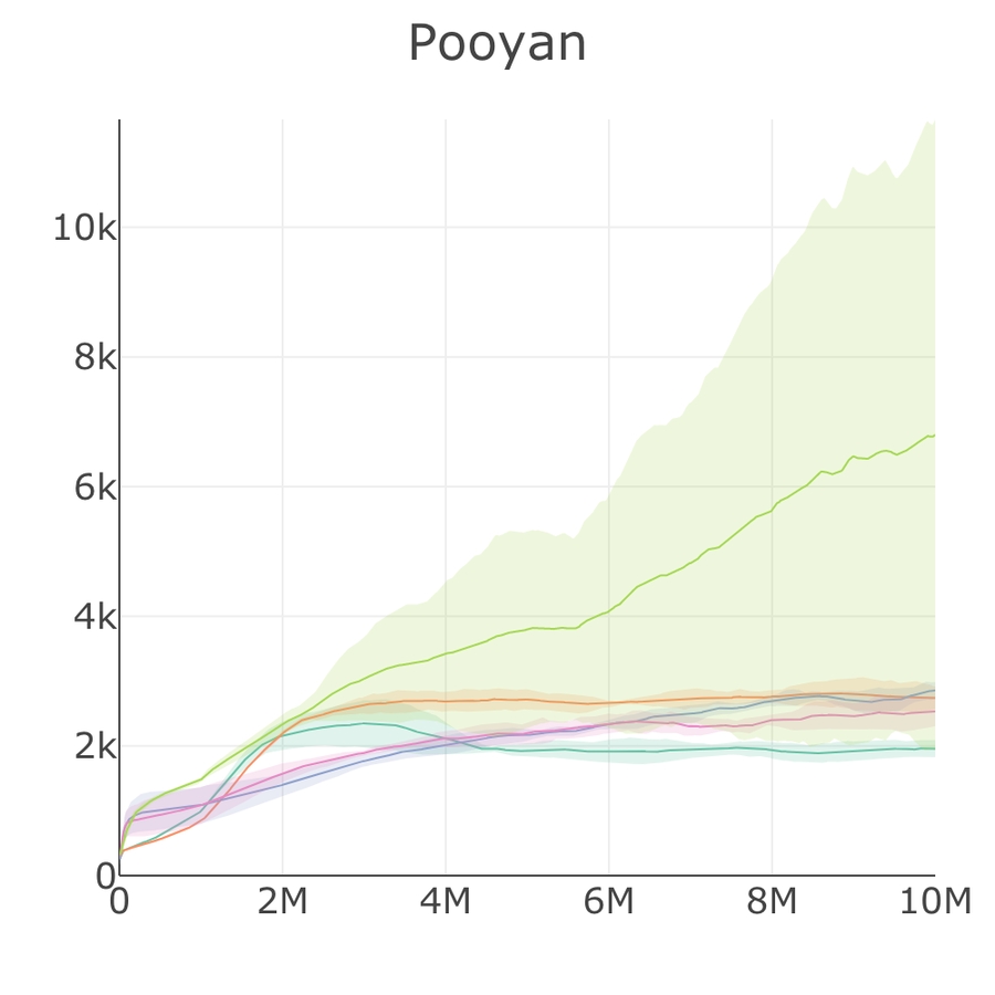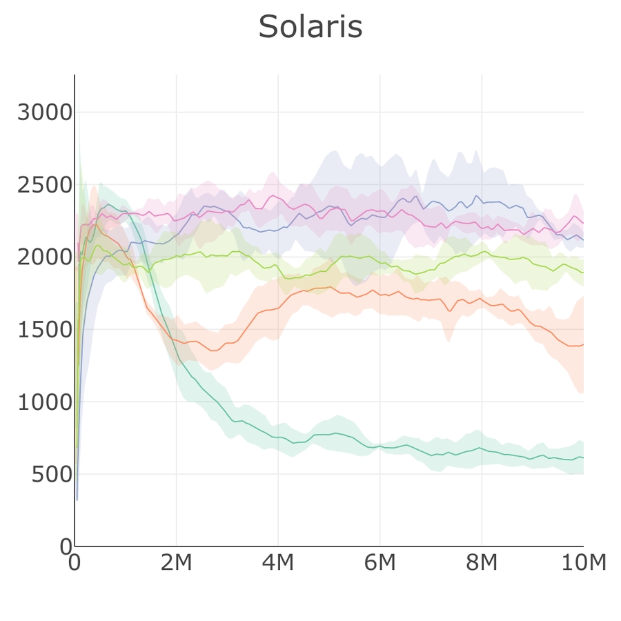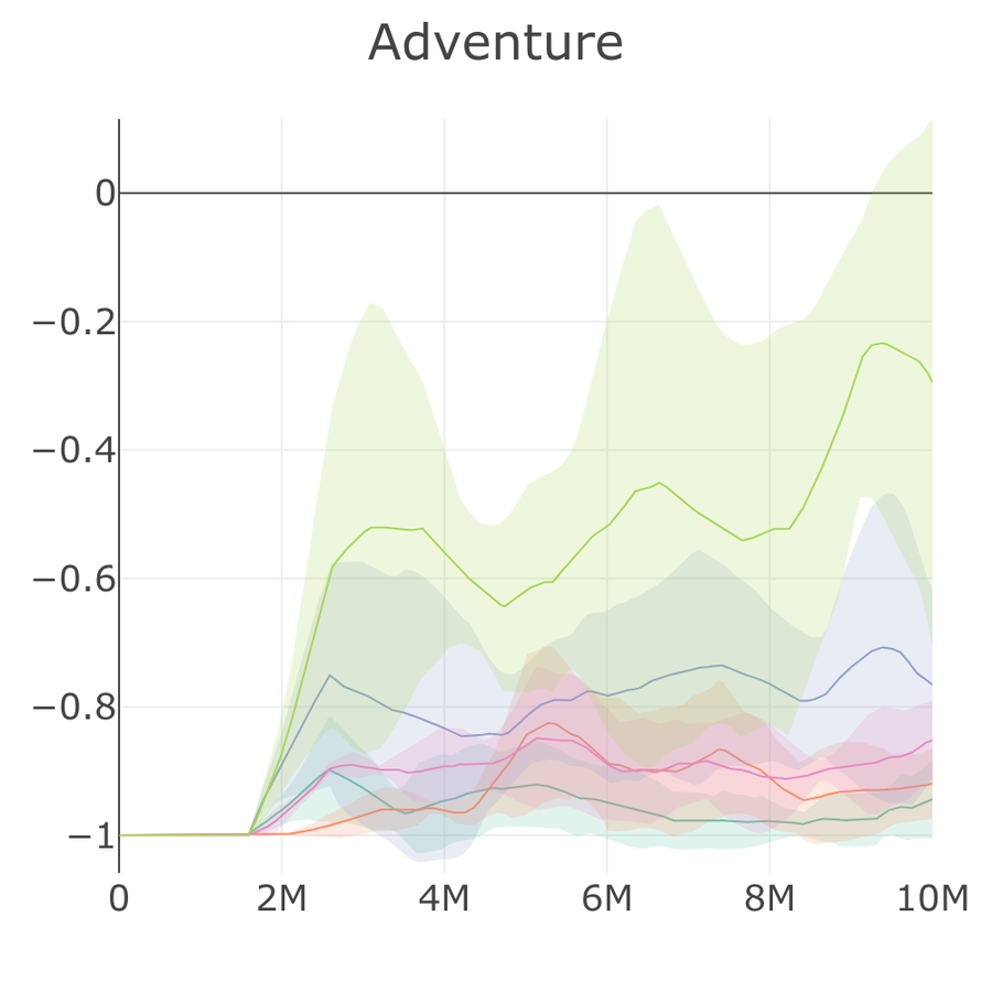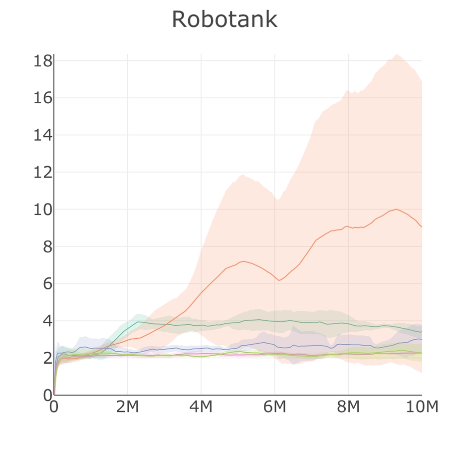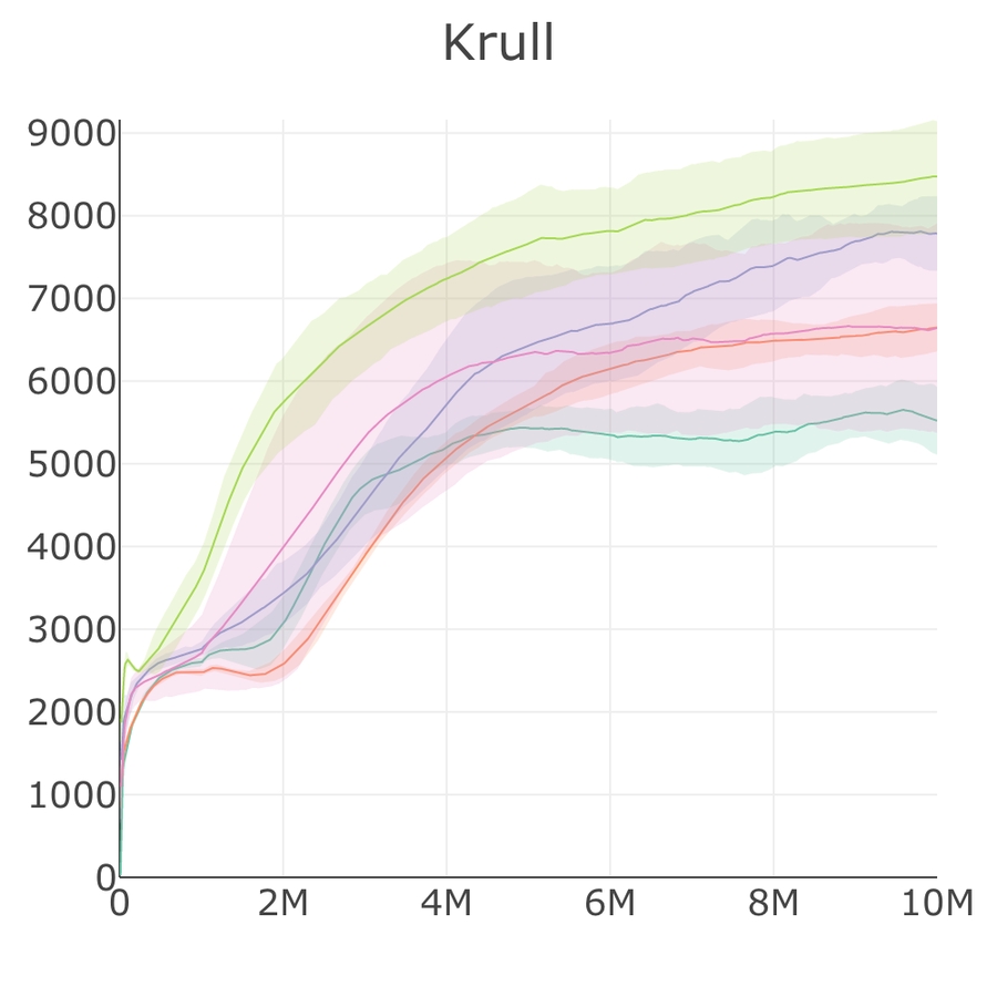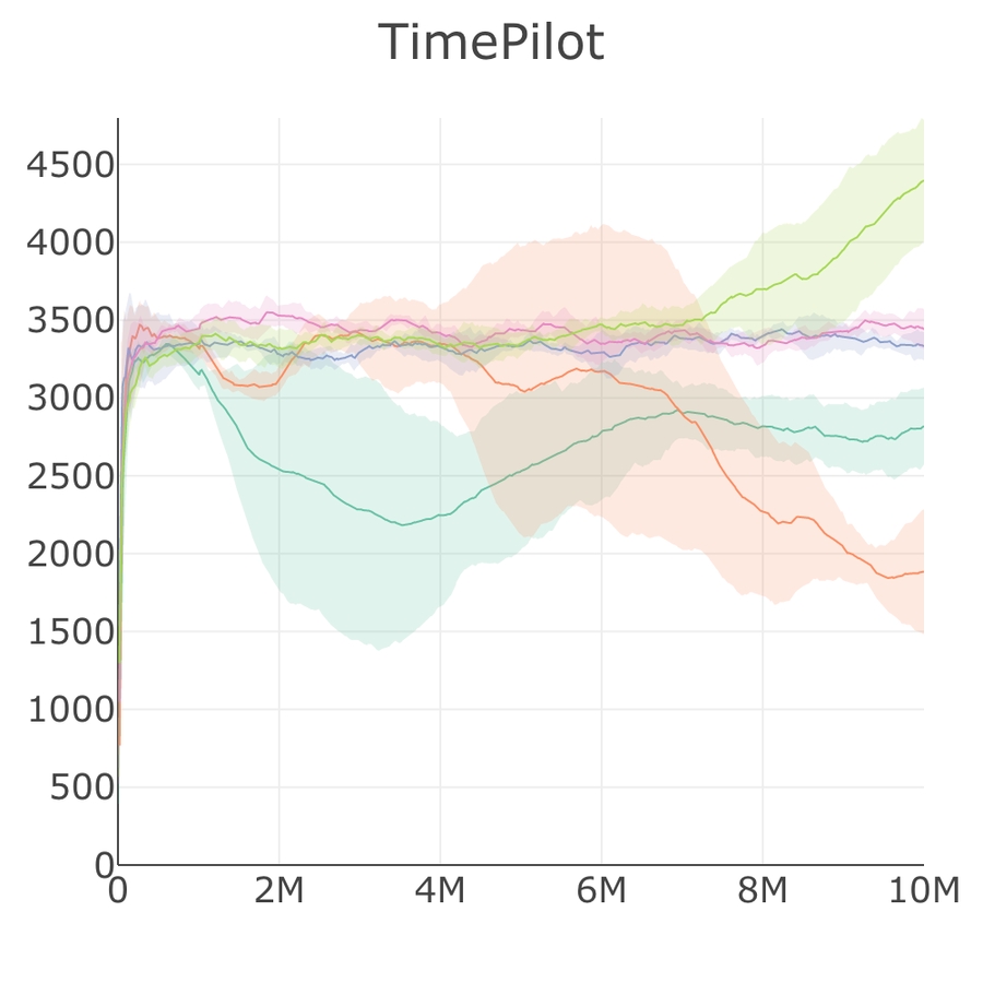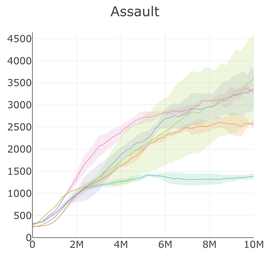 The table above presents results for 62 Atari games. All agents were trained for 10M frames (40M including skipped frames). Reported results are the episode score at the end of training, averaged over the previous 100 evaluation checkpoints with each checkpoint averaged over 4 Sessions. Agents were checkpointed every 10k training frames.