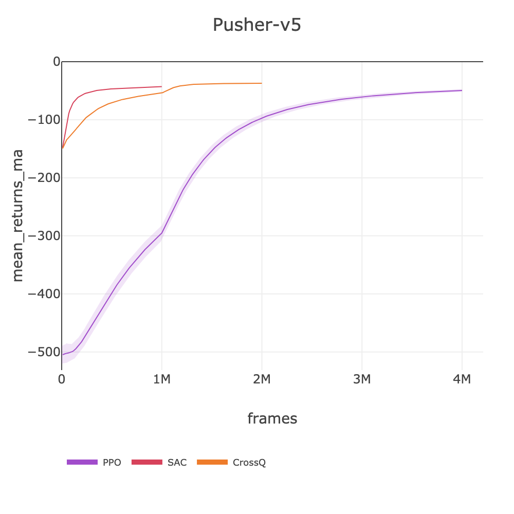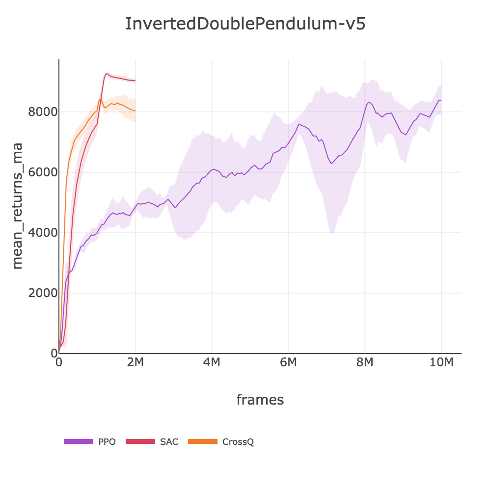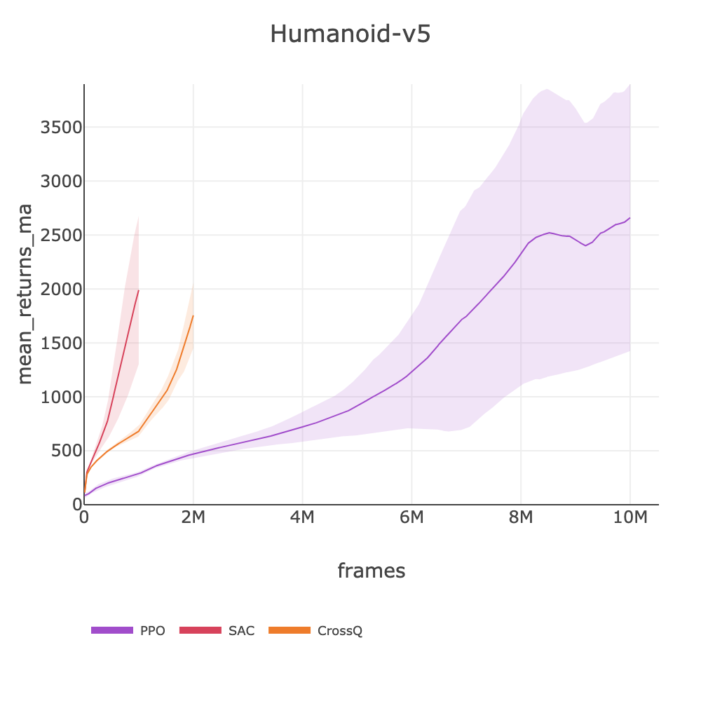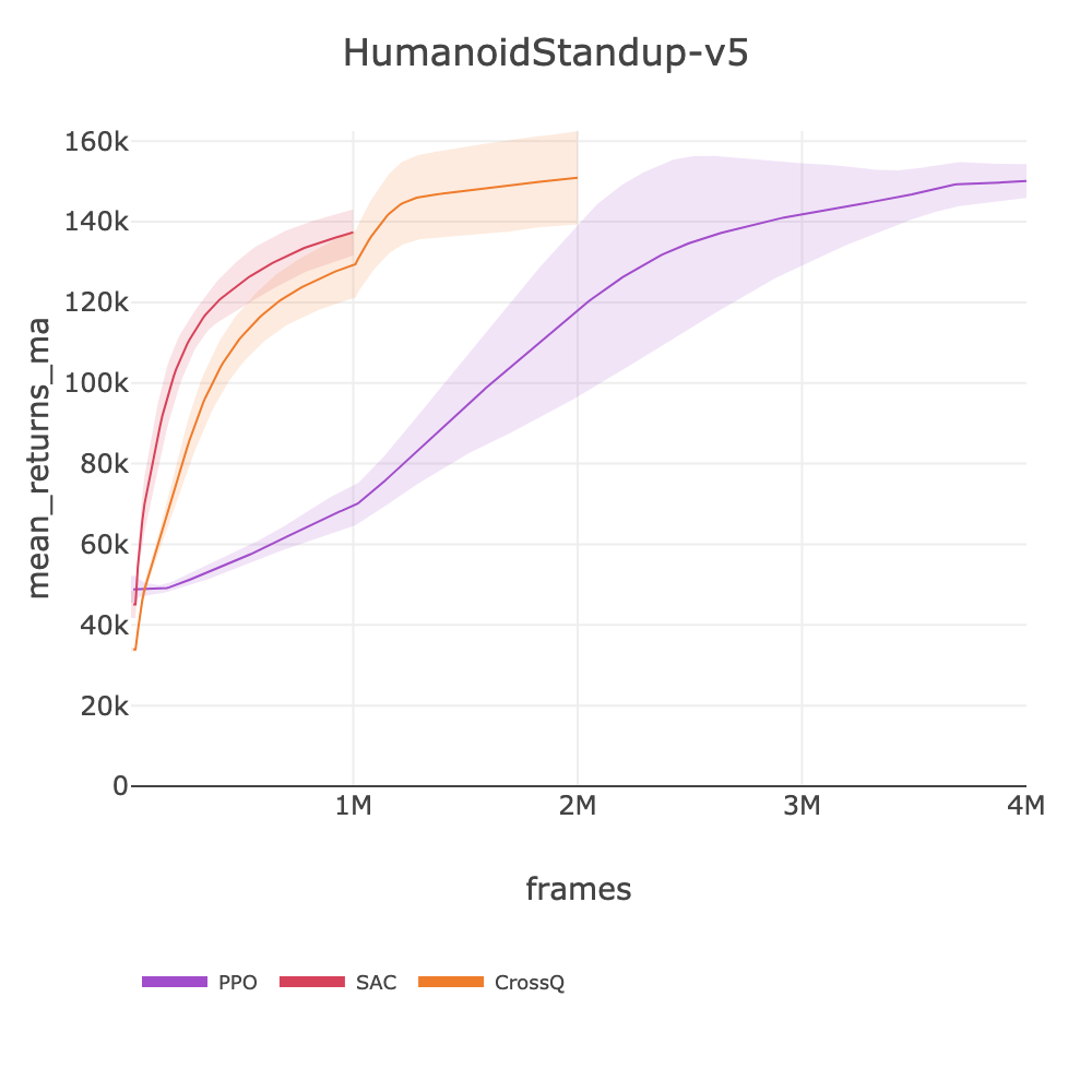 Note on frame budgets: SAC uses higher update-to-data ratios, making it more sample-efficient but slower per frame than PPO (1-4M frames vs PPO's 4-10M). CrossQ uses UTD=1 (like PPO) but eliminates target network overhead, achieving ~700 fps โ its frame budgets (3-7.5M) reflect this speed advantage. Scores may still be improving at cutoff.
