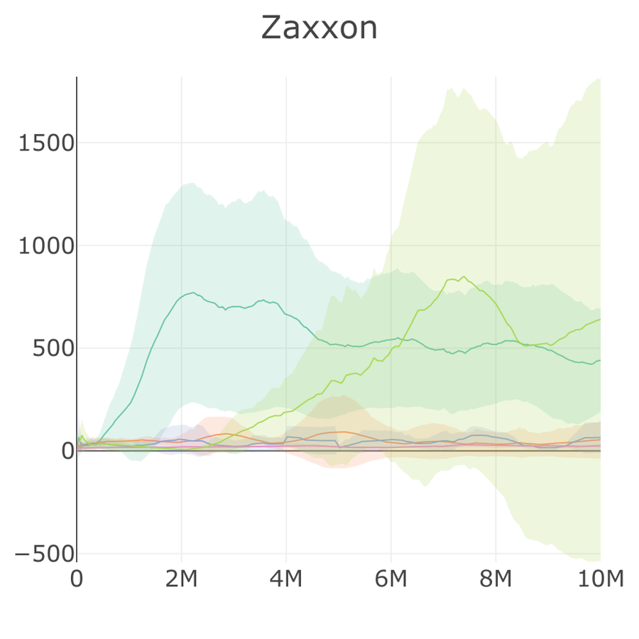 The table above presents results for 62 Atari games. All agents were trained for 10M frames (40M including skipped frames). Reported results are the episode score at the end of training, averaged over the previous 100 evaluation checkpoints with each checkpoint averaged over 4 Sessions. Agents were checkpointed every 10k training frames.